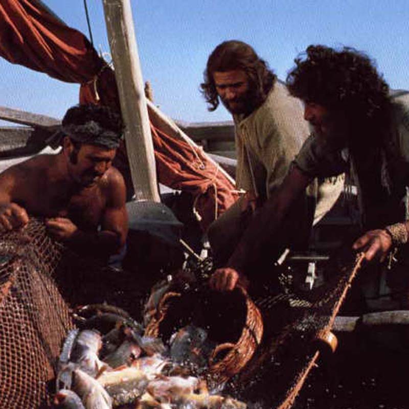 Pero no hay espera. La soga se pone tirante y la red tensa. Pedro apoya su peso contra el costado de la barca y comienza a jalar la red; extiende su mano hacia abajo, hala hacia arriba, la extiende hacia abajo, hala hacia arriba. Está tan inmerso en la tarea que se le escapa el mensaje.